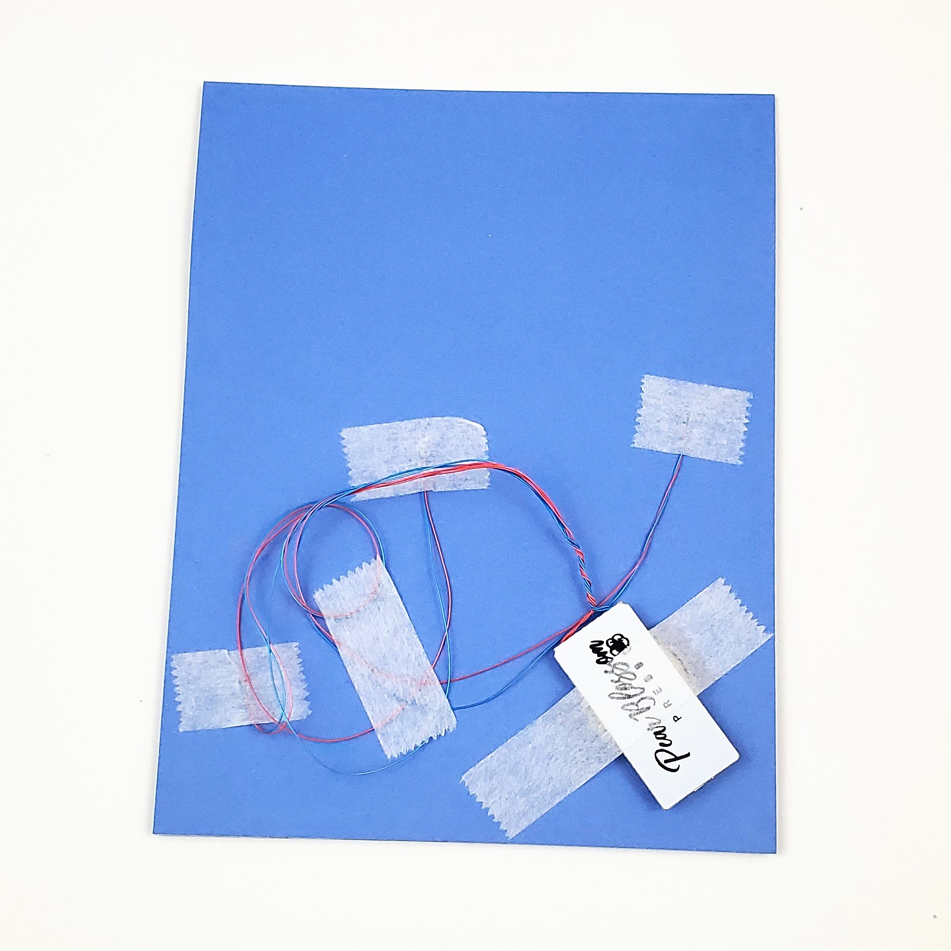 To assemble the card, I first used foam tape to adhere the buildings to the background. Then, using a craft pick, I pierced holes in the background behind the tops of the building spires, and behind the center of a building on the right side of the card. On the back of the panel, I placed each of the three lights that comes with an EZ-Light into each small hole and then taped down the wires with paper tape. I slipped the battery into the housing and then taped down the housing as well, with the button behind a building on the left side of the panel.