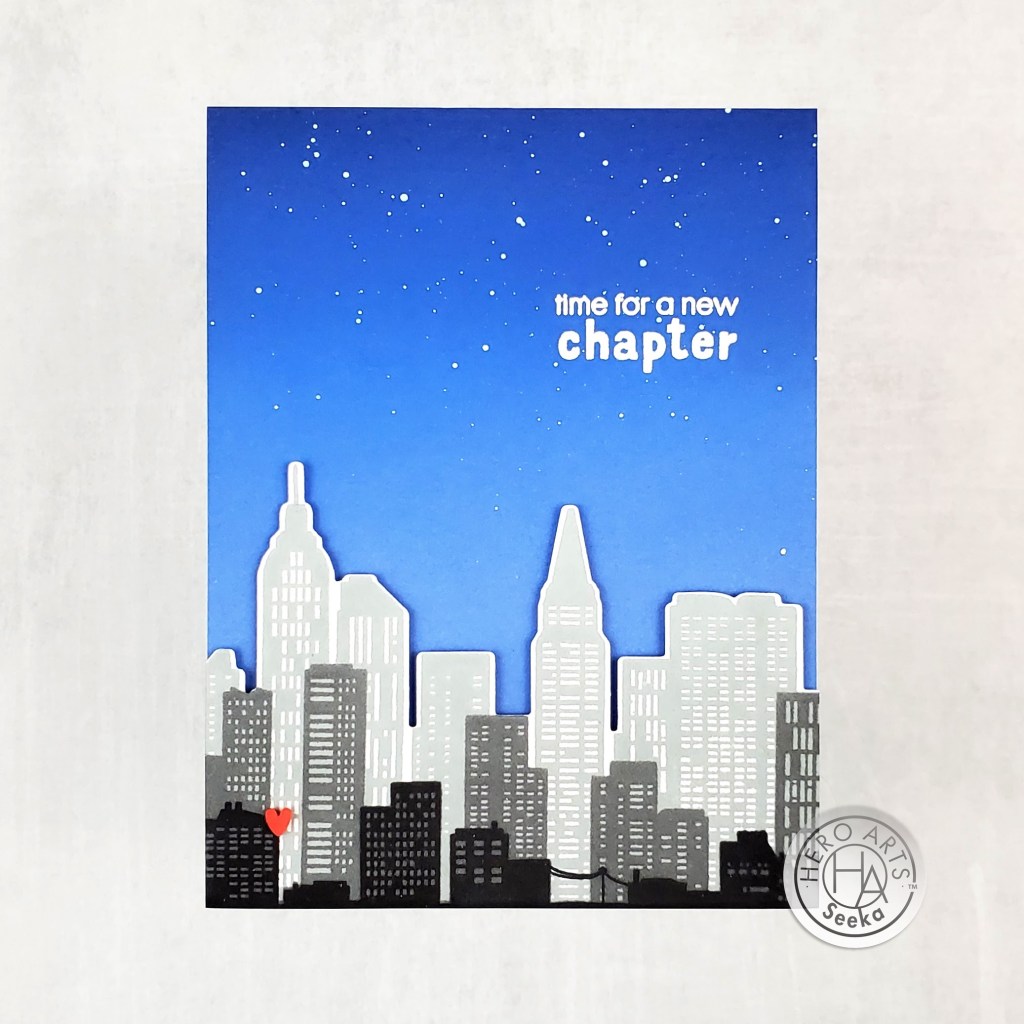 I started off my EZ-Light card by stamping the three layers of buildings in the Hero Arts City Heroscapes stamp set onto Dove White cardstock. I stamped first layer in Soft Granite, the second layer in Charcoal, and the top layer in INTENS-ified black ink. Using the coordinating die, I cut out the image and set it aside.