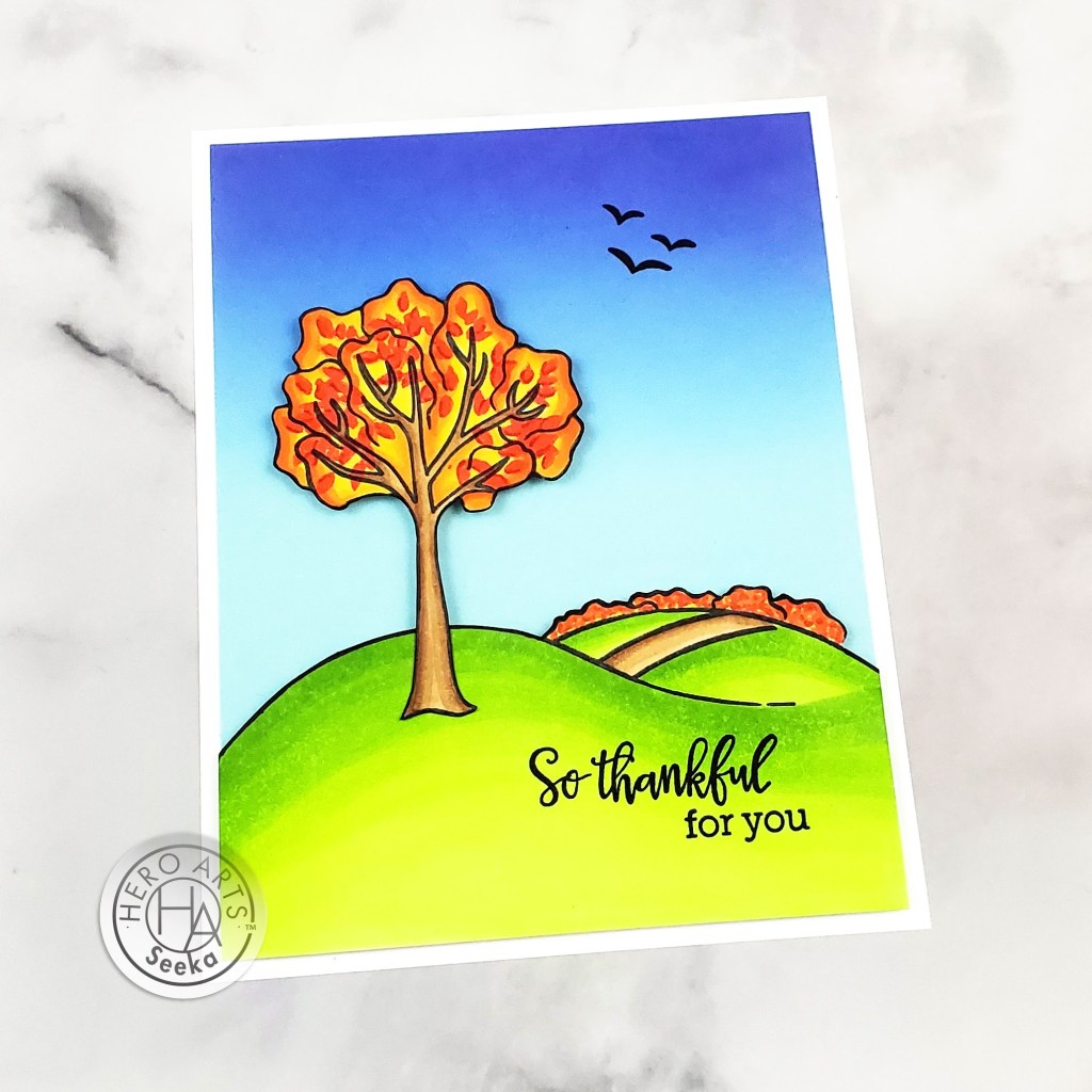 I started off by stamping the hill onto an A2-sized piece of Neenah Solar White 80# Classic Crest cardstock in Copic-friendly Hero Arts Intense Black ink. Then I used.a Copic Multiliner to extend the arcs of the hills to span the entire panel. Using a selection of green, brown, yellow, and orange markers, I colored in the little scene. Then I fussy cut the hill and set it aside while I stamped, colored, and fussy cut the tree. Next I used the two leaves stamps to stamp additional foliage on the tree in Hero Arts Fruit Punch Reactive ink.