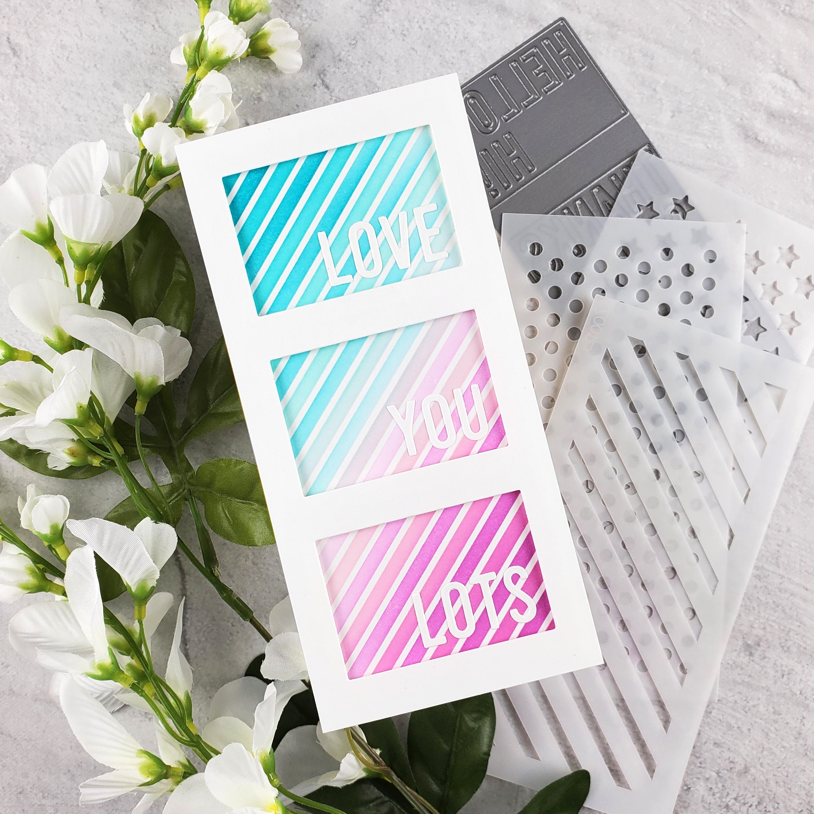 Next, I used the Mini Slimline Windows to cut three windows from my second panel, setting aside all of the fallout letters. I used Darice Double-Sided Adhesive Foam Strips to adhere the window panel over the background. Then I adhered the letters, spelling out “Love You Lots.”