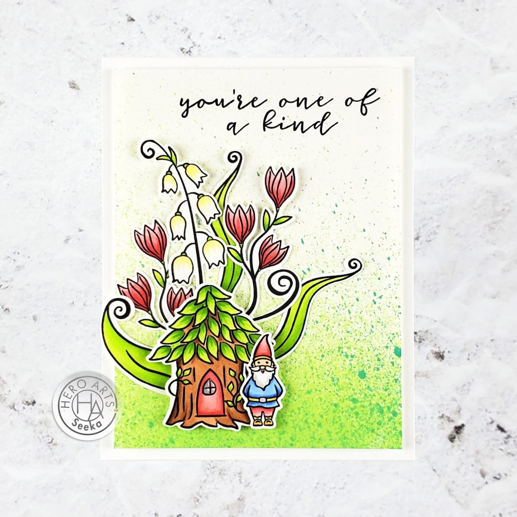 The splattered background on the gnome card is the perfect touch! Loving the lily of the valley stamp.