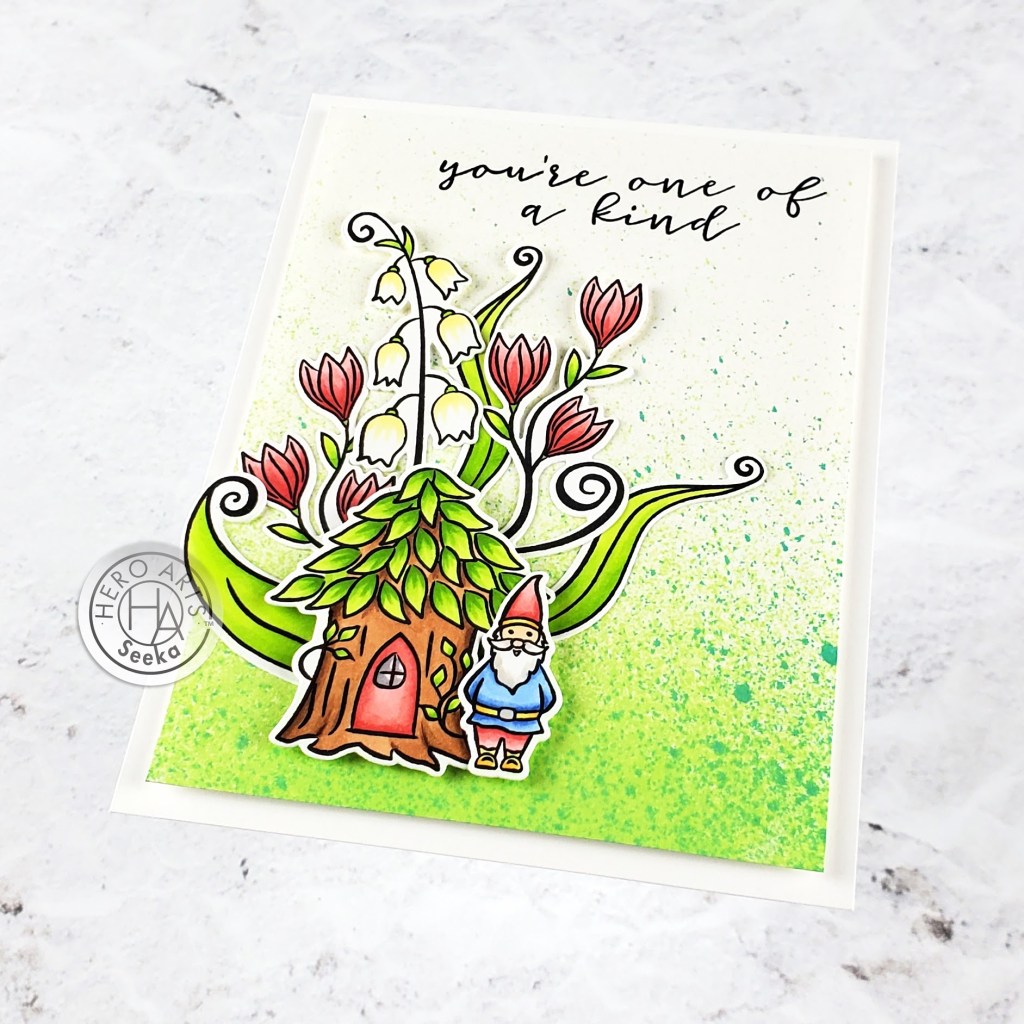 To assemble the card, I adhered the plants using glue and then adhered the gnome and his house using foam tape. Then I used more foam tape to adhere the card front to an A2-sized card base.