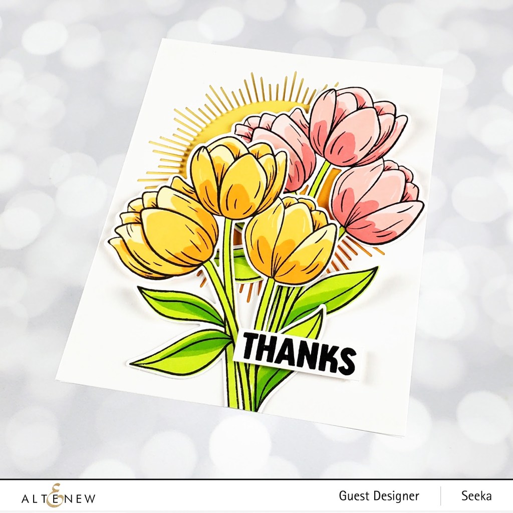 My first card features the new Cartoon Tulips stamp set and coordinating dies (also available as a bundle) against a backdrop created with the Mid-Century Frame die.