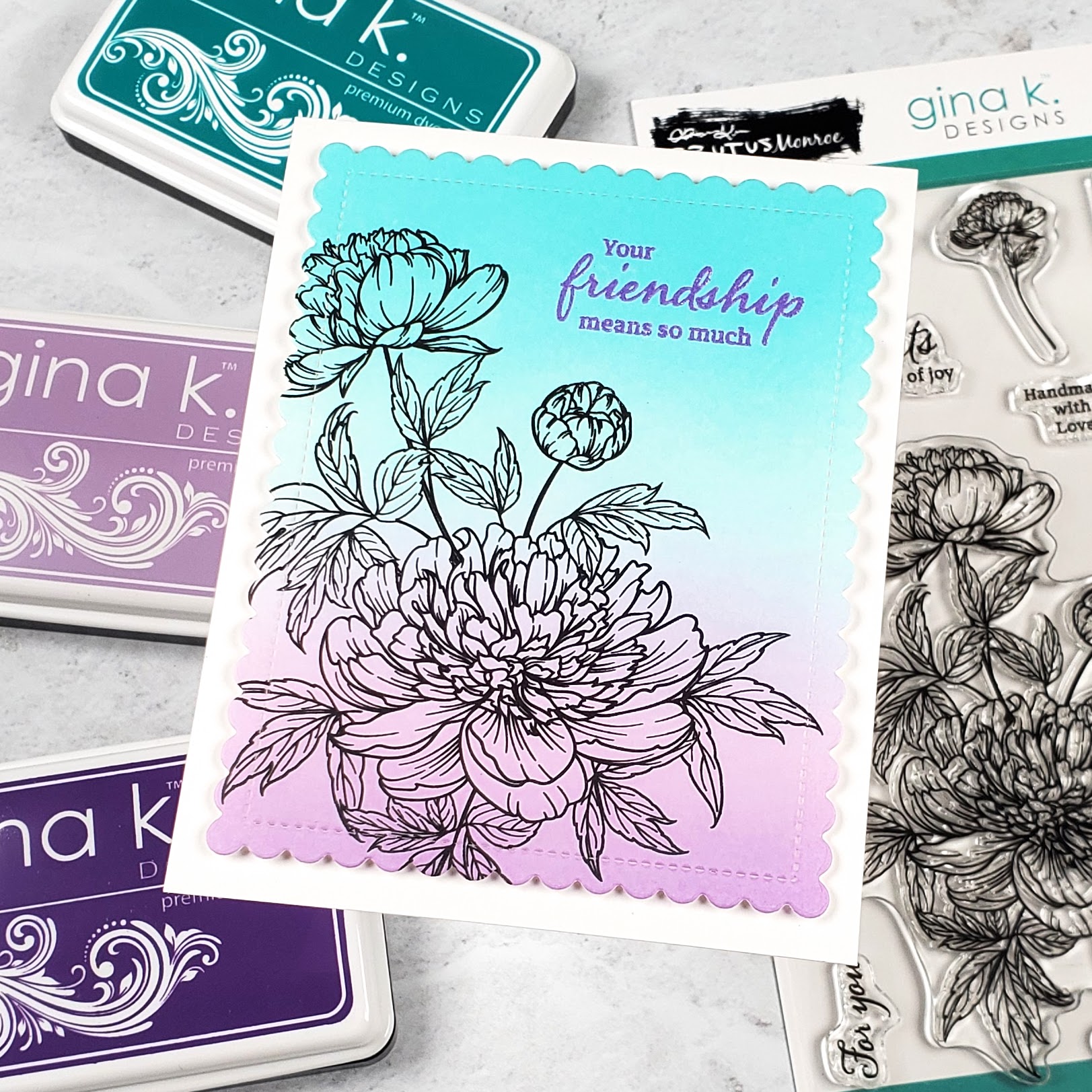 I started off by using blending brushes to blend Turquoise Sea, Lovely Lavender, and Wild Lilac inks over a 4.25″ x 5.5″ panel of white cardstock. Next, stamped the large bloom image in black pigment ink. When the ink was dry, I used the scalloped frame die in the Master Layouts 4 die set to cut the panel. Then, I used the new Gina K. Designs and Brutus Monroe Wisteria Lane embossing powder to heat emboss the sentiment, which is also from the stamp set. To finish, I used foam tape to adhere the panel to a card base.