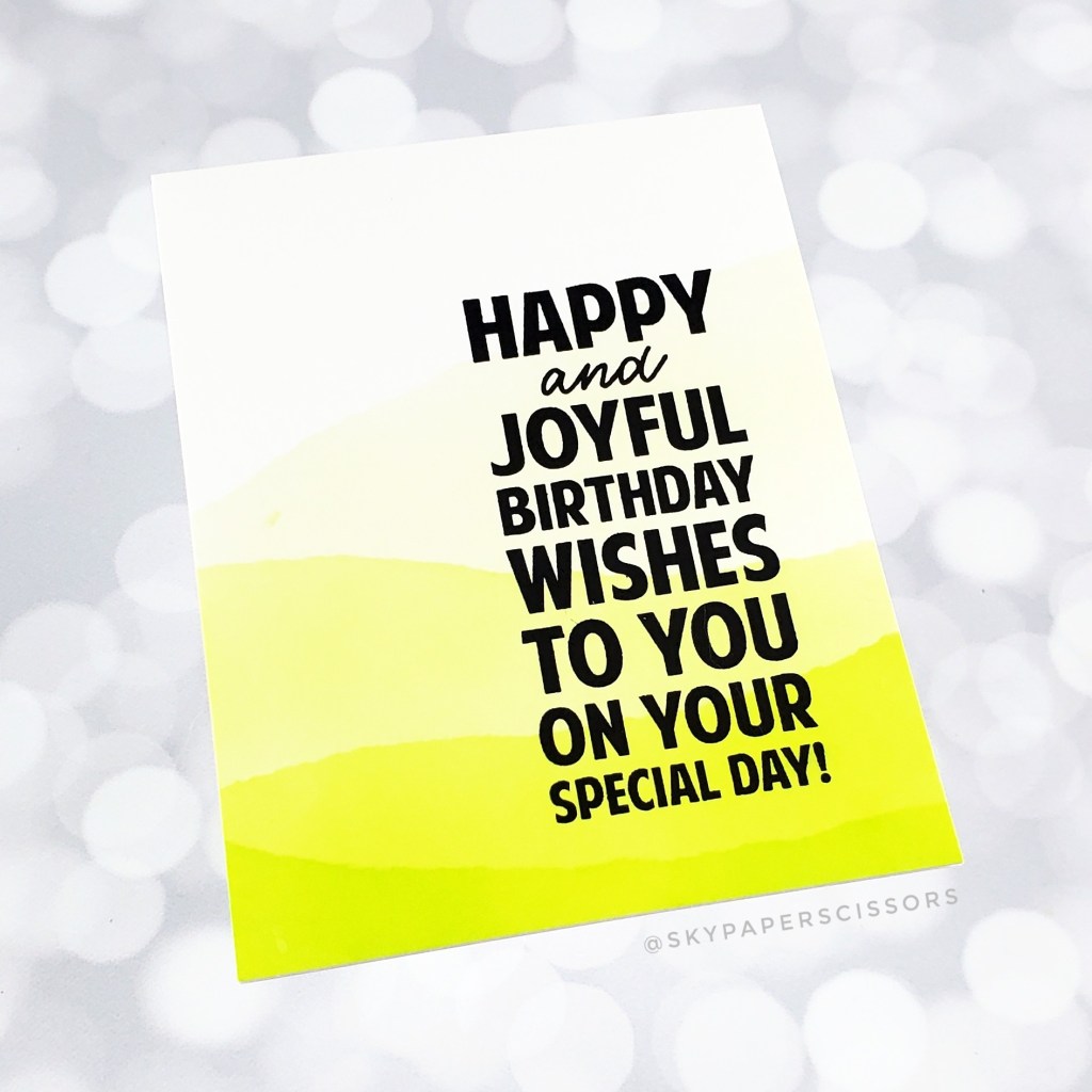 For this clean and simple and bold card, I started by creating a 4.25″ x 5.5″ background using light green inks and a mask made with two-inch Post-It tape (any kind of masking paper will do). I began by cutting a roughly 5″ piece of tape and then I tore it into two pieces along its length. I then used one piece to mask off a jagged line about 2/3 up the panel and covered everything above the masked line with scrap paper to protect it. Using a blending tool, I blended a very light layer of Celery ink over the exposed bottom area of the panel.