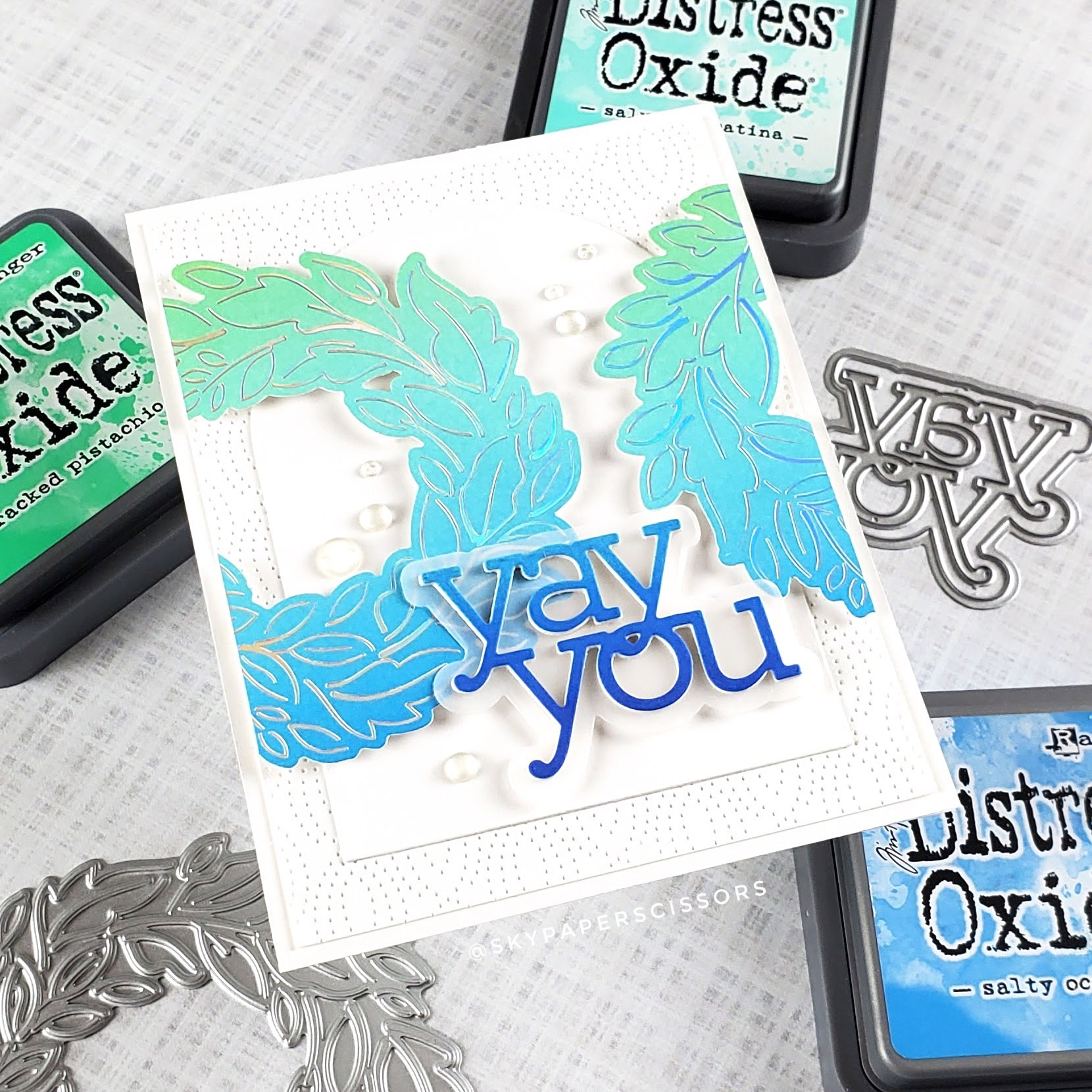 Next, I used the Yay You Words die to cut the detail sentiment five or six times from white cardstock. I blended Salty Ocean and Blueprint Sketch Distress Oxide inks onto one of the die cuts and then stacked and adhered it to one of the extra die cuts. I glued the piece to the shadow layer, which I cut from vellum, and then I stacked and adhered the remaining detail die cuts together, trimmed part of the first “y” away, and adhered the piece underneath the vellum (this provides a surface to glue to the background without worrying about glue showing through the vellum, and the trimmed away part leaves room for the popped up wreath).