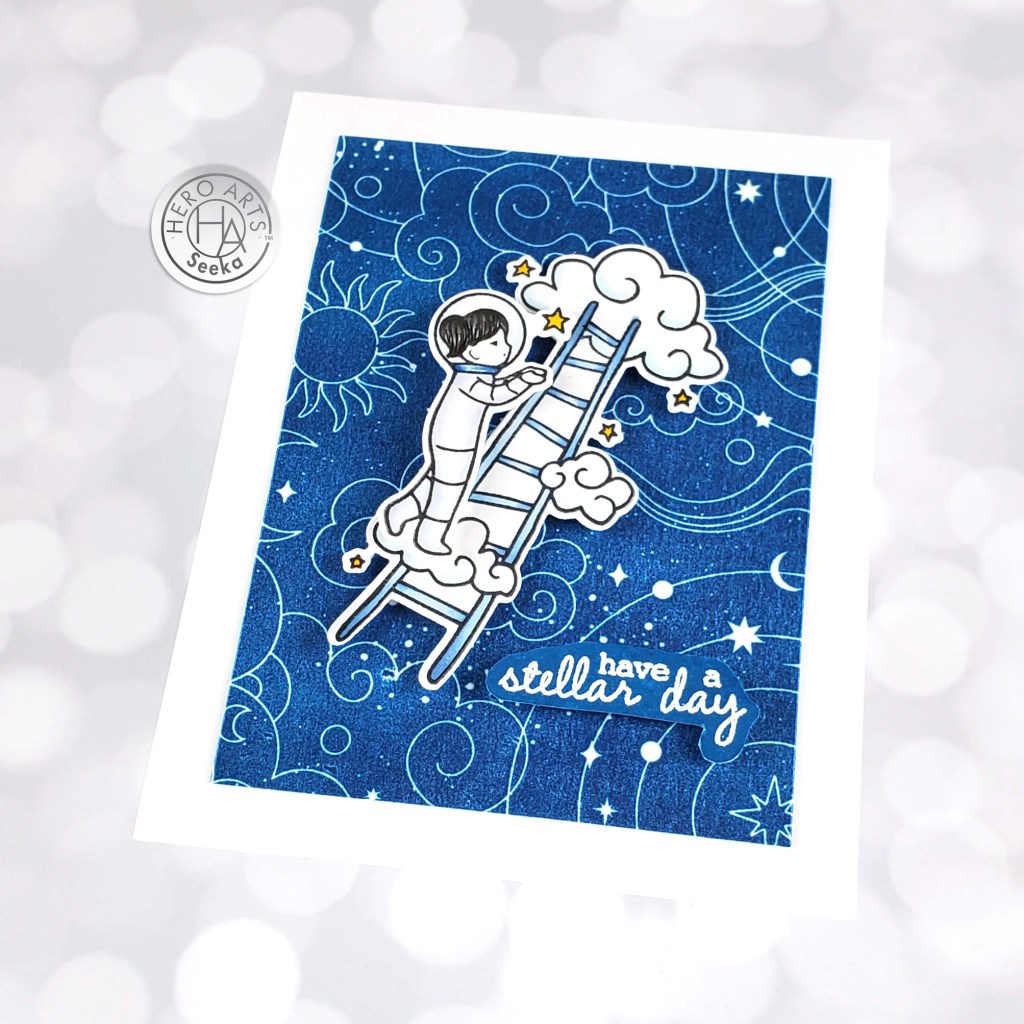 For this card, I stamped the background in Deep Ocean. Then I stamped and colored the cute ladder and astronaut images using blue, yellow, and gray markers to create a mostly monochromatic scene. I cut the images out using the coordinating dies and then added them, and a heat embossed sentiment, to the background.