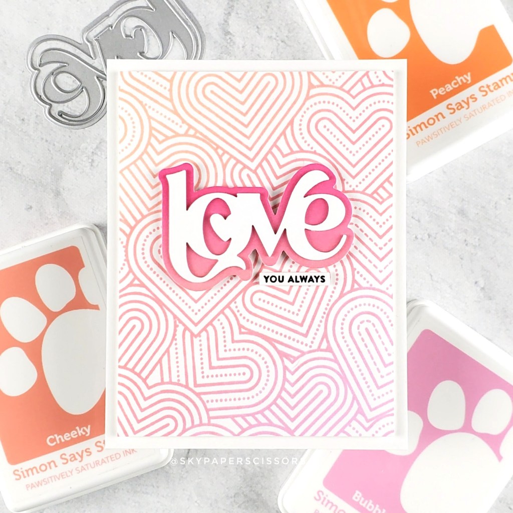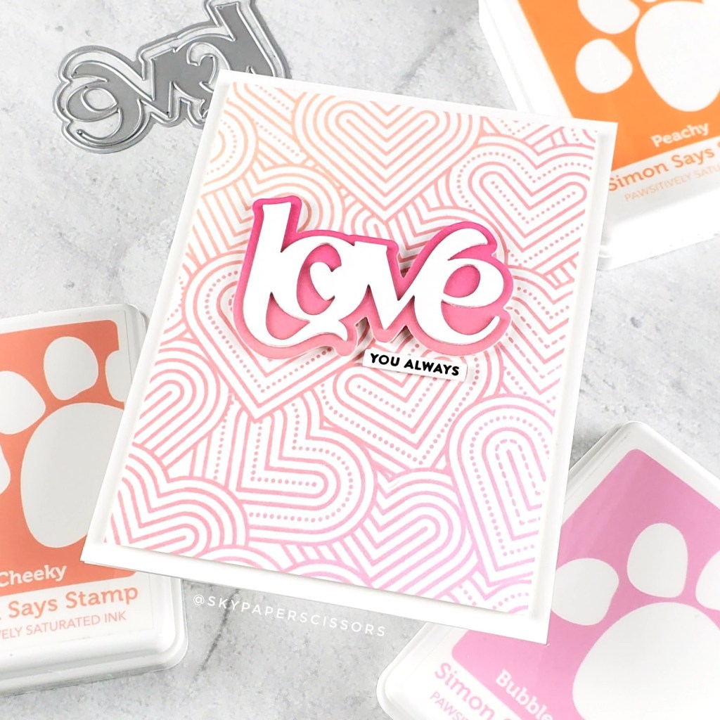 The Simon Says Stamp Hugs release is live and there’s a lot to love! I have three quick cards to share, all feature the new Jumbled Hearts cling stamp. This graphic background is so fun!