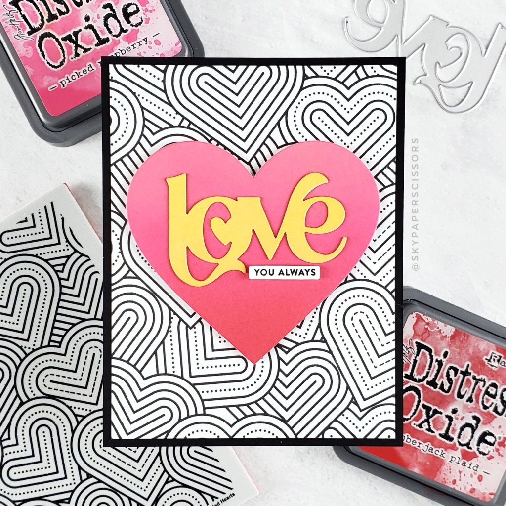 This second card features the same background stamped in black and paired with an ink-blended heart with a fun yellow love sentiment. I really like this new sentiment die, I know I’ll be using it a lot!
