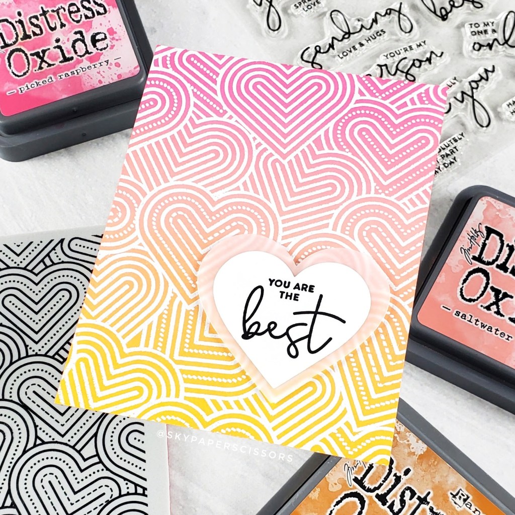 My first card features an ink-blended background. I blended Distress Oxide inks and then, when the ink was dry, heat-embossed the background stamp image over it in white embossing powder. Then I added a sentiment from the new Love You Greetings stamp set which I stamped on a white heart and layered over a vellum heart.