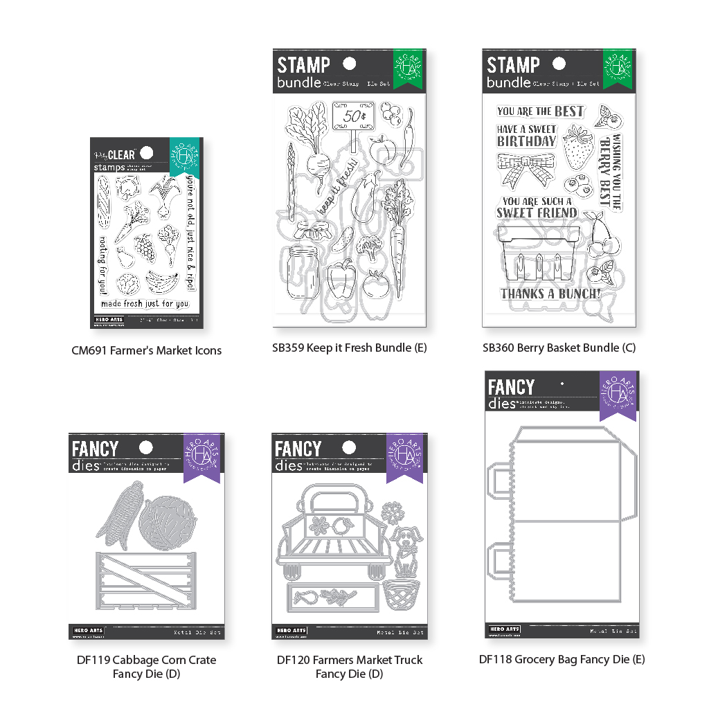 This month we’re taking a trip to the farmer’s market. The Classic My Monthly Hero Kit includes a 6×8 stamp set loaded with various fruits that are fun to color, fruit-themed puns and some everyday messages as well. Use these stamps alone, or pair them with a fabulous fruit-themed 6×6 cling background stamp. Also included is a packet of the most adorable little clay fruit, great for shaker cards or to use as embellishments. In addition to the previous items, the Premium version of the kit (which I used here) includes additional elements to extend the potential for more cards and techniques – even more Creativity In The Box! There is a fantastic window die, carrying through the theme of fruits and vegetables. Also included are two of the brand new Neon Brights Liquid Watercolors for you to try, and a set of mini watercolor brushes. The kit is rounded out with an ink cube and a generous amount of watercolor paper and cardstock.