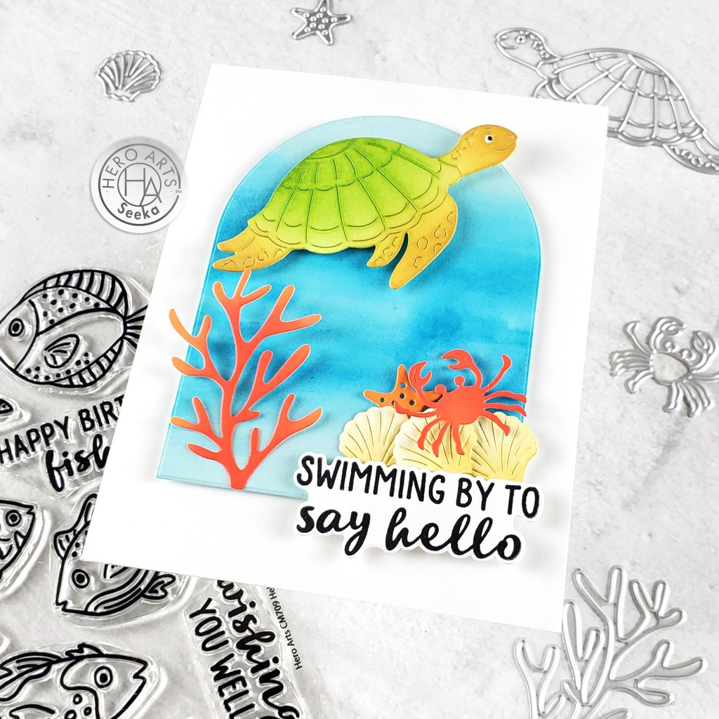 My second card features the new Sea Creatures Fancy Die set. First, I used a die from the Arches Infinity die set to cut an acrylic paint-smooshed panel. Then I used dies from the Sea Creatures set to cut ocean elements from different colors of cardstock. Using blending tools, I added ink to both color and shade each piece. I glued them to the arched panel and then used foam tape to adhere the panel to a card base. To finish, I added a sentiment from the Hello Fishes stamp set.