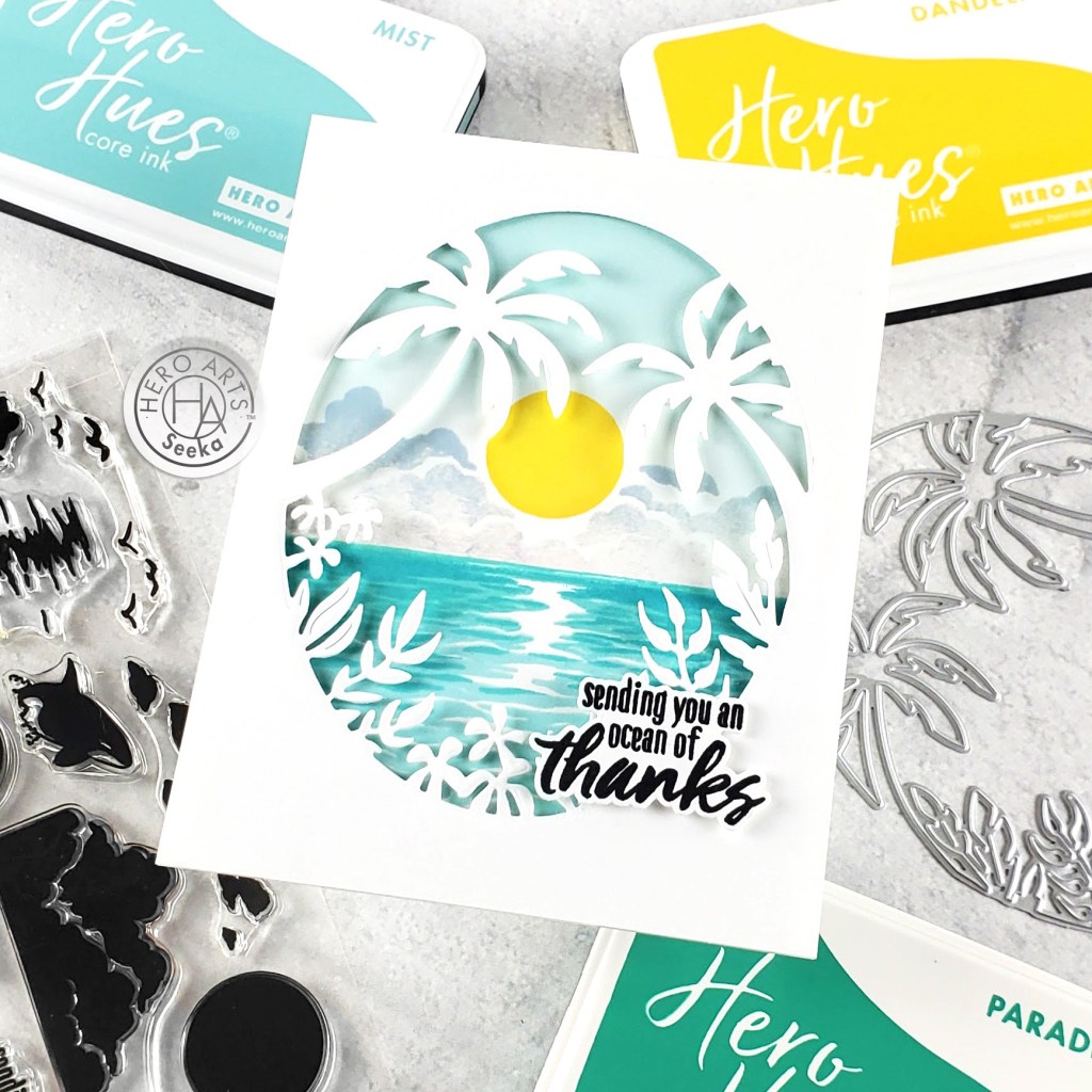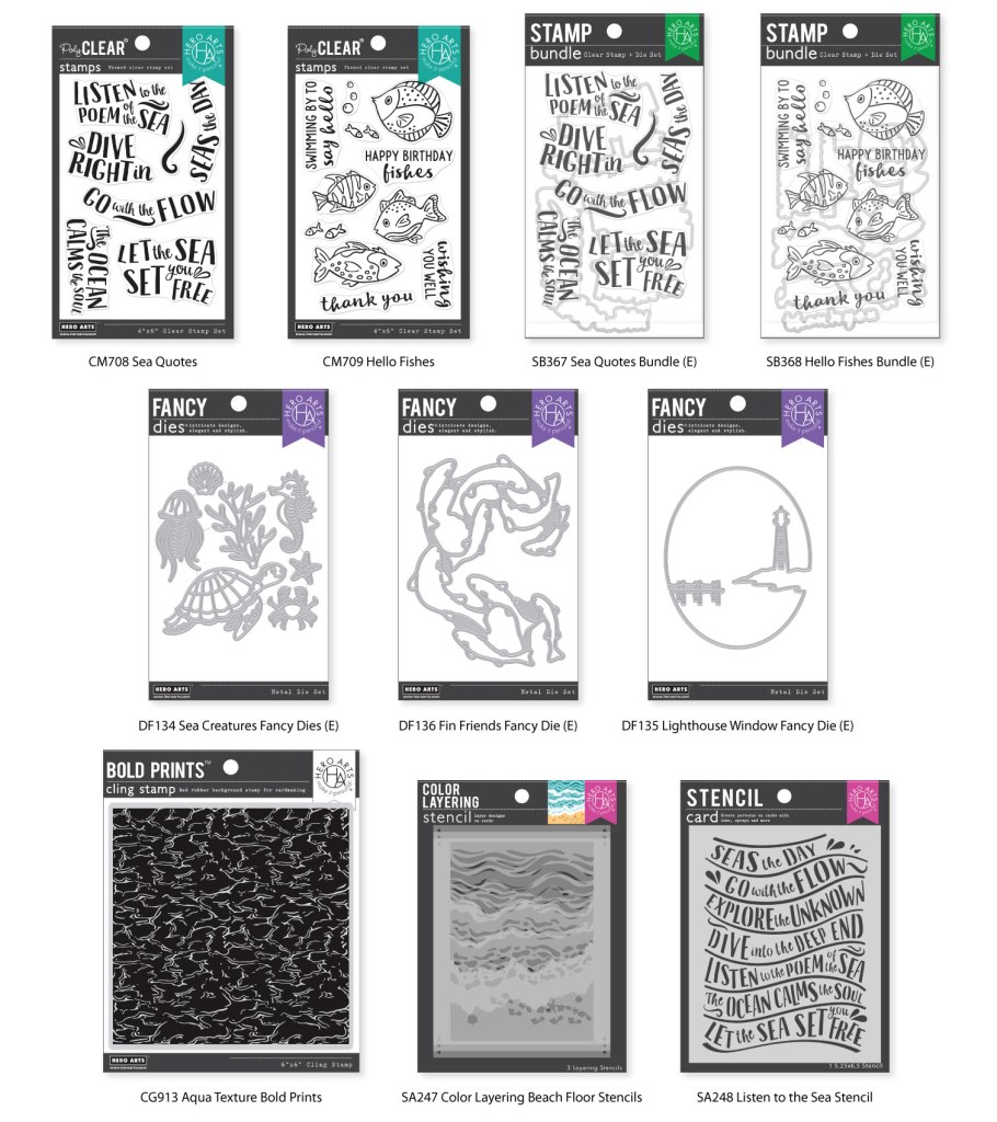 The June release My Monthly Hero kit features a Color Layering stamp set that captures the magical play of light on the ocean at sunset. The Classic Kit includes a 6″ x 8″ stamp set featuring this HeroScape scene, including images to add embellishments, such a dock, a lighthouse and sea birds. There are coordinating dies, as well as a beautiful oval window die to set the beach scene. The Classic Kit is rounded out with four ink cubes in perfect sunset colors, and six sheets of watercolor paper. The upgraded Premium kit includes everything in the Classki Kit plus a fun three-piece stencil set for creating a seashell background. Or cut out the stenciled shells as individual project elements! There are embellishments galore, including both custom sequins and enamel stickers. The Premium Kit is capped off with a tub of a gorgeous, brand new iridescent embossing powder. Try this powder on both light and dark cardstocks for varying results!
