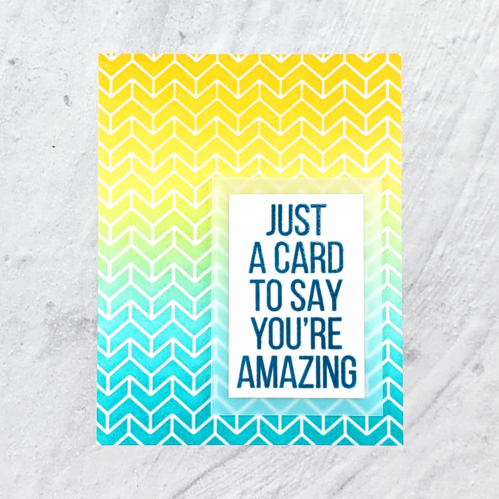 Today I have a quick and easy card to share featuring a little ink blending over the Large Chevron Pattern stencil from Simon Says Stamp. This aqua to yellow gradient is such a cheerful and summery palette to me. What colors would you use?
