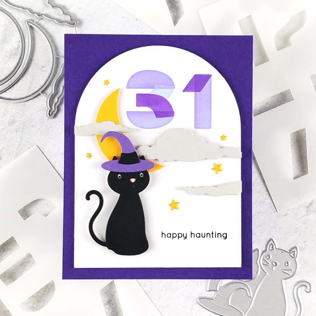 I die stamped and die cut the crystal ball from blue papers and then used the Bonus Magic Mist stencil (which you receive if you purchase The Whole Studio) to add some wispy smoke inside the orb before stamping the sentiment.