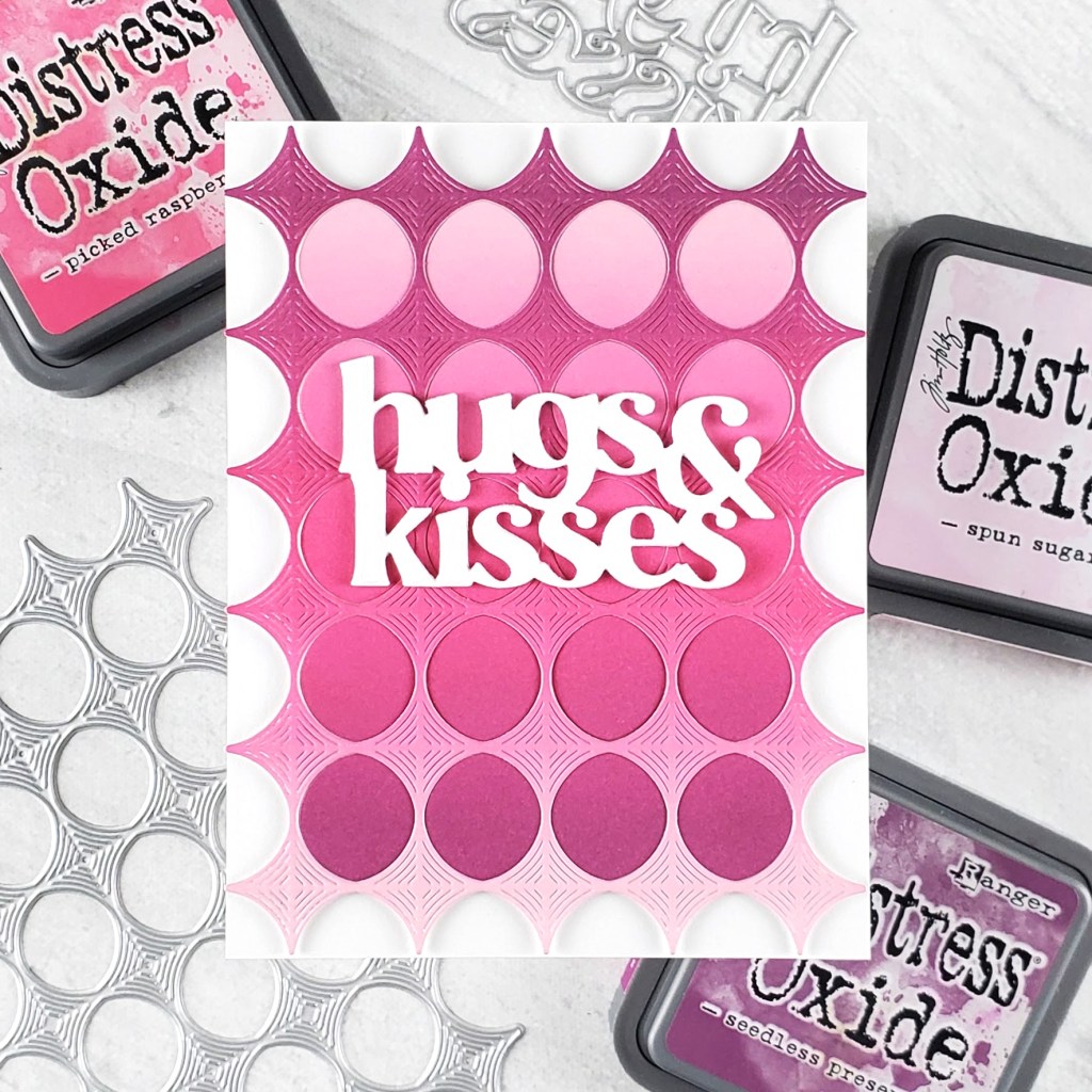 My next card features the Lots Of Love stencil. I blended Amethyst and Ultra Pink inks over the stencil, concentrating the pink in the center of a 4.25″ x 5.5″ panel of white cardstock. Then I used a two heart dies from the Card Kit of the Month to cut a small heart from the center of the stenciled panel, and a slightly larger heart from a piece of Passion Flower cardstock.