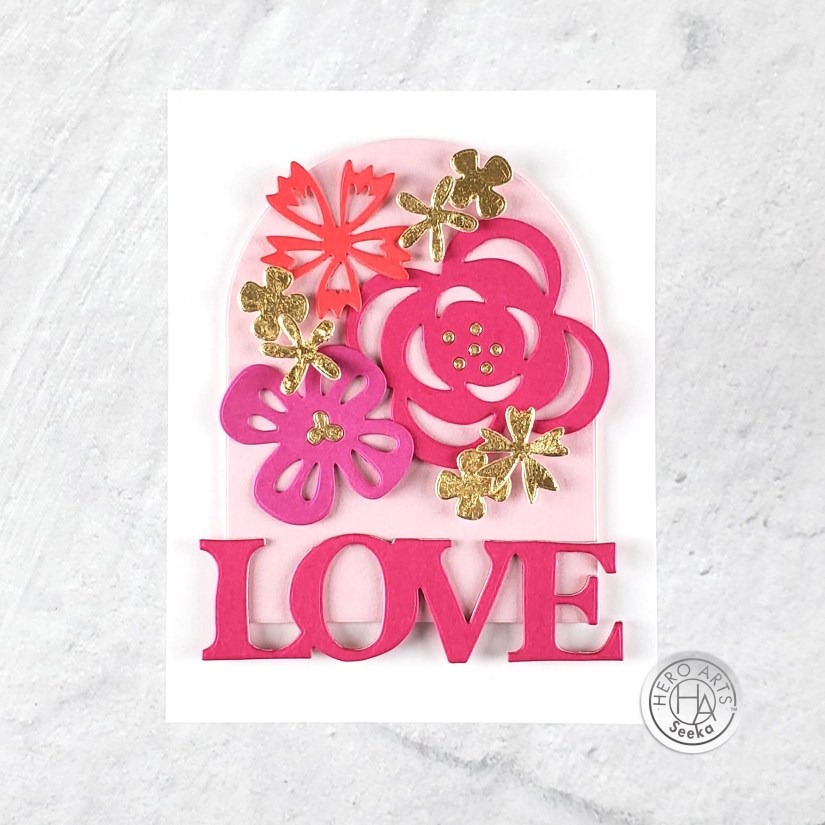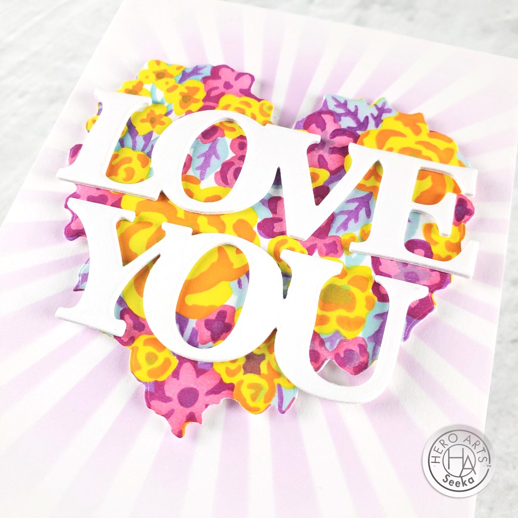 To finish, I die cut the sentiment from Iris cardstock using a die from the Love & Hearts die set and popped up at the center of the card front.