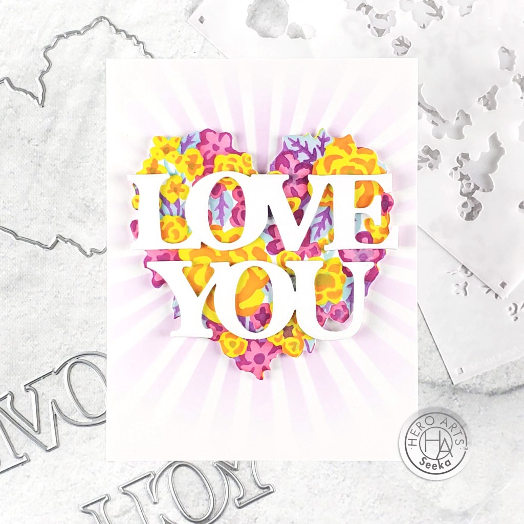 I glued the stenciled panel to a card base and then used foam tape to adhere the Passion Flower and stenciled hearts over the negative space left when I die cut the small heart out of the panel.