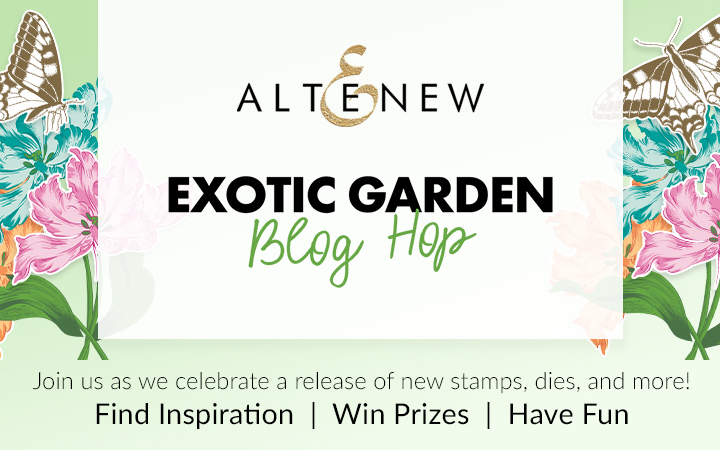 We’re celebrating the release of the Altenew Exotic Garden Stamps/Dies/Stencils/Embossing Folders Collection! If you arrived from Reiko Tsuchida’s blog, you’re right on track. If you want to hop along from the beginning, visit the Altenew Card Blog. Check the bottom of this post for giveaway information and the full blog hop list.