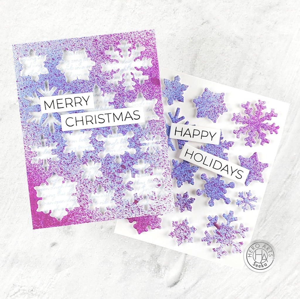 My first two cards are a quick and easy two-for-one pair. I used sprays to quickly add color to a 4.25″ x 5.5″ panel of white cardstock and then I used the new Snowflake Pattern Cover die to cut the panel. I used foam tape to adhere the fall out snowflakes to another panel of white cardstock and then added a sentment.