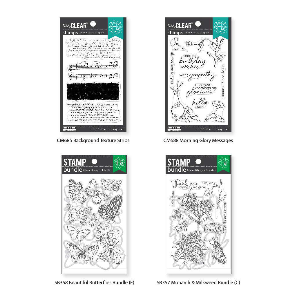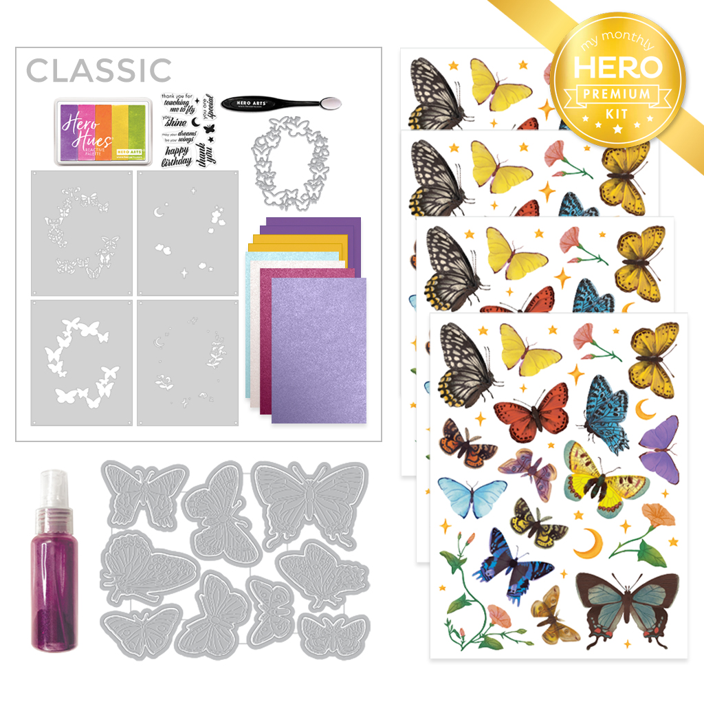 The February My Monthly Hero Premium Kit features a favorite theme for many stampers – butterflies! Presented in a unique way, combined with flowers, stars and moons, the fluttering butterflies create a gorgeous window die. Coordinating layering stencils make adding color to your die cut a breeze. There is a palette ink pad that includes Thistle, Taffy, Creamsicle, Lemon Drop, and Key Lime Fizz Reactive Inks, and a perfectly sized small blending brush. A 3×4 stamp set includes both uplifting and everyday sentiments, and the kit is rounded out with cardstock, both solid and shimmery. This Premium version of the kit includes additional elements to extend the potential for more cards and techniques – even more Creativity In The Box! There are four sheets of beautiful butterfly Hero Transfers, a butterfly die set that can be used to cut out the rub-on images but also stands alone, and an exclusive Fuchsia & Gold Luster Duo Spray that will be sure to make you swoon!