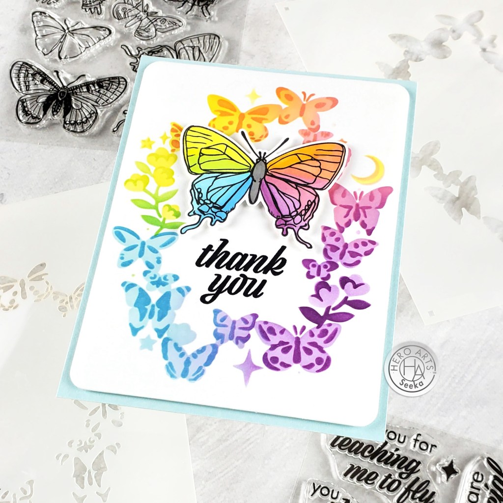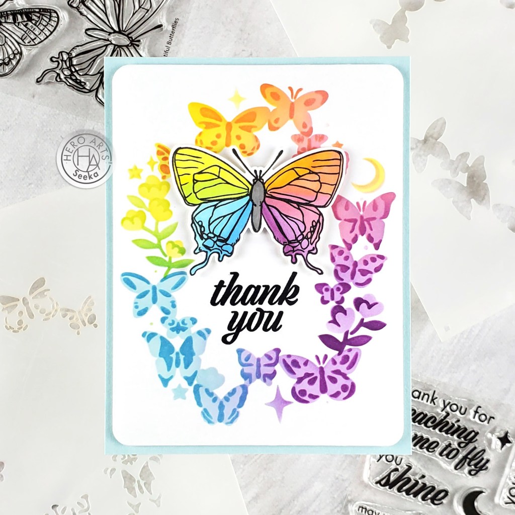 My card today features layering stencils from the Classic kit, plus a stamped, colored, and die cut butterfly I made using the Beautiful Butterflies bundle. I used a rainbow of Hero Arts inks to blend the ring of butterflies and then used similarly colored Copic markers to color the large butterfly.