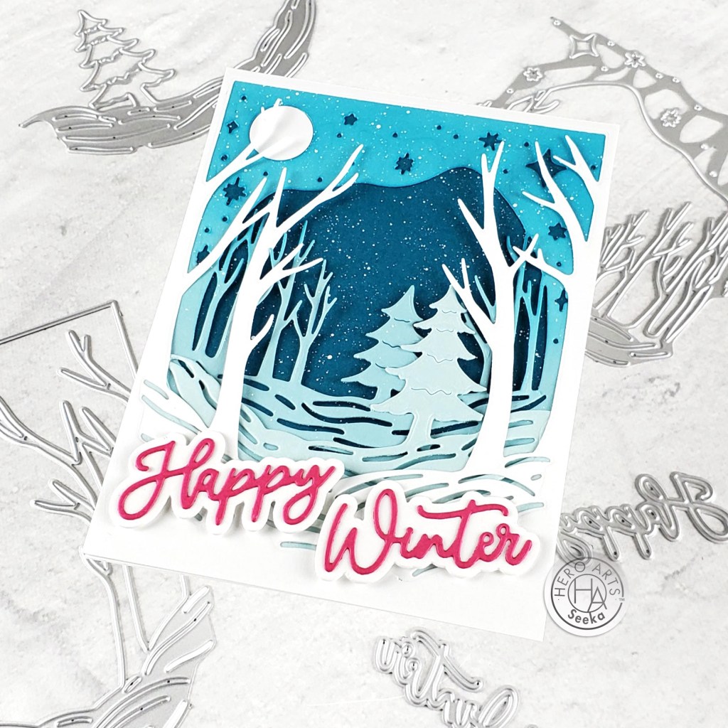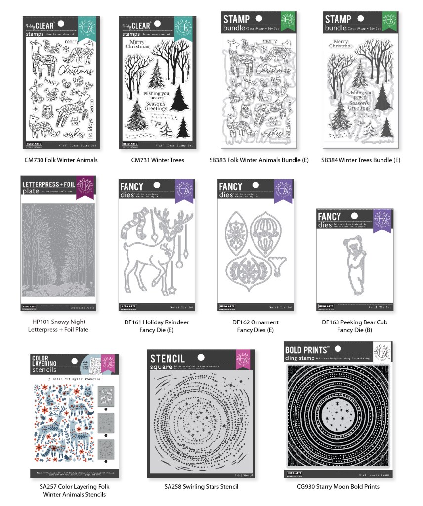 The Hero Arts October release transports you to a snowy night in the forest. This month’s Classic kit features a set of three gorgeous layering dies for building your wintry scene. A 3″ x 4″ stamp set supplies swirling snow and stars. There are four message dies with frames; very useful for the holiday season. The highlight of the expanded Premium kit is a set of three “peeking” animal dies. Add them to your winter scene for a whimsical touch. There’s also a 4″ x 6″ stamp set featuring images with a Nordic flare for building ornaments, flowers, snowflakes, and more. We’ve included a fun new product making its kit debut – white acrylic spray! A generous assortment of cardstock enhances the theme. The finishing touch to the Premium Kit is a set of beautiful vellum snowflakes.