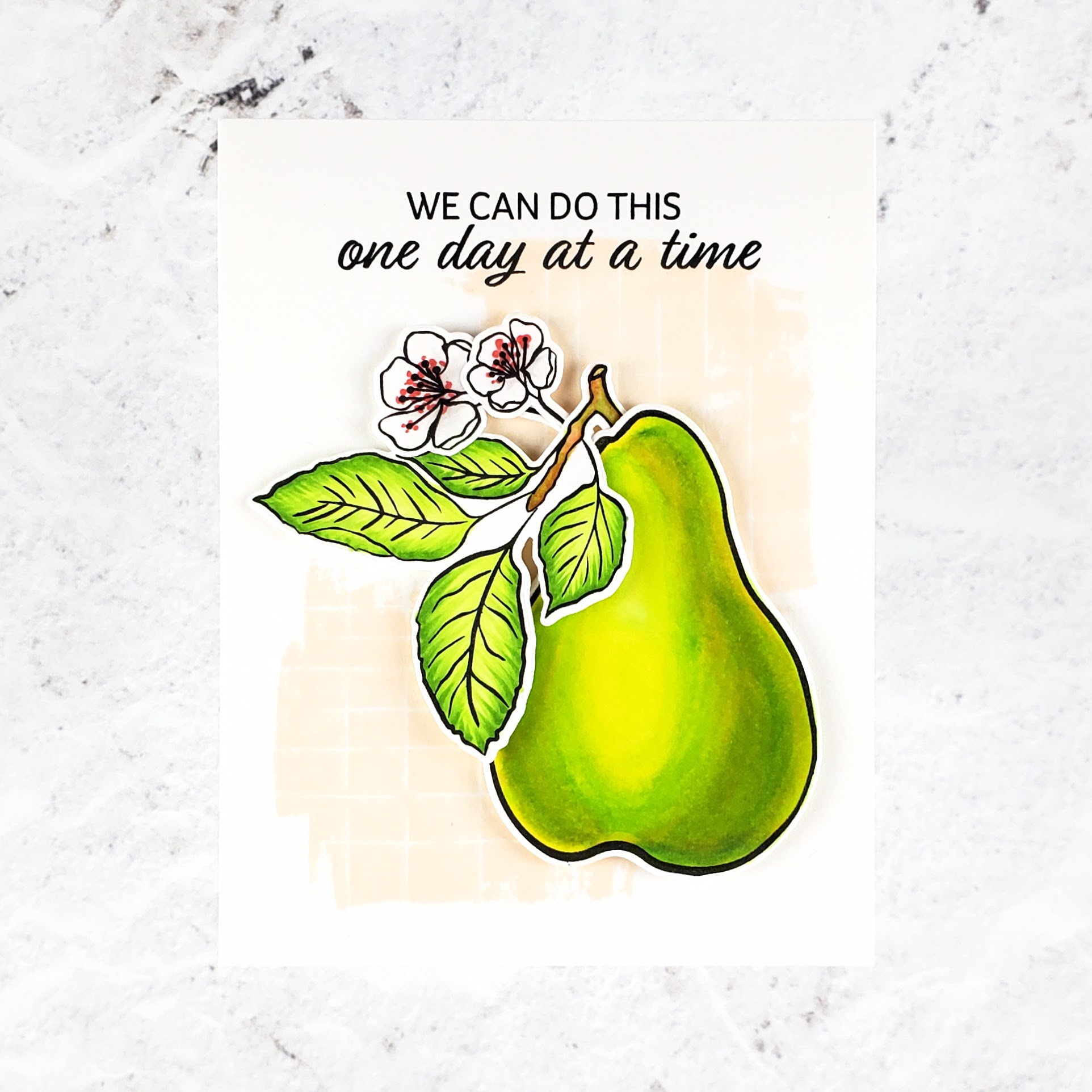 The new Gina K. Designs release is live (see what’s new at the moment here) and I got to play with the new One Day At A Time stamp set which also has coordinating dies. This pretty new set has two pears of different sizes as well as leaves, florals, and a texture stamp that can be used with the pear or separately for a completely different look!