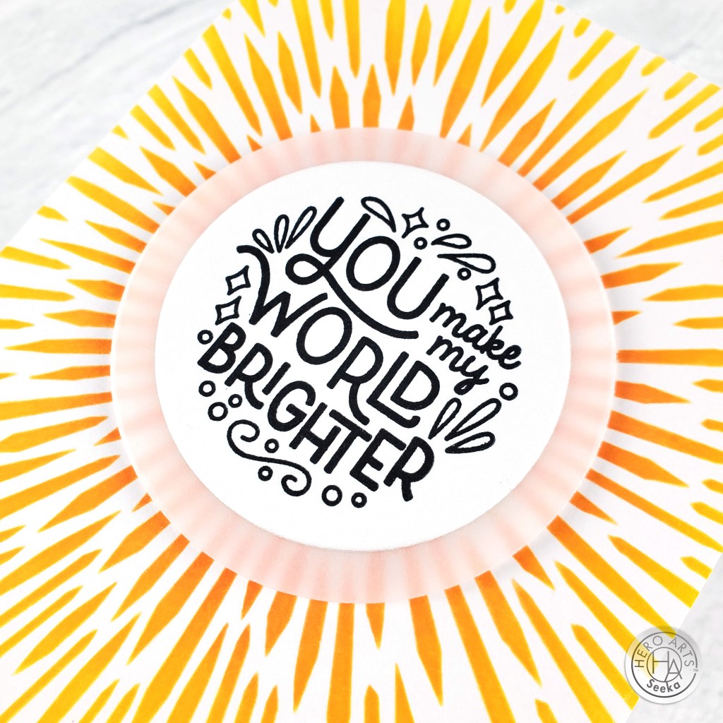 For my card today I used Creamsicle and Lemon Drop Reactive inks to create a background using the stencil from the Premium kit. Then I use the small stamp set in the Premium kit to stamp this sentiment which I die cut using a die from the Circles Infinity die set. I die cut a slightly larger circle of vellum which I glued to the back of the sentiment.