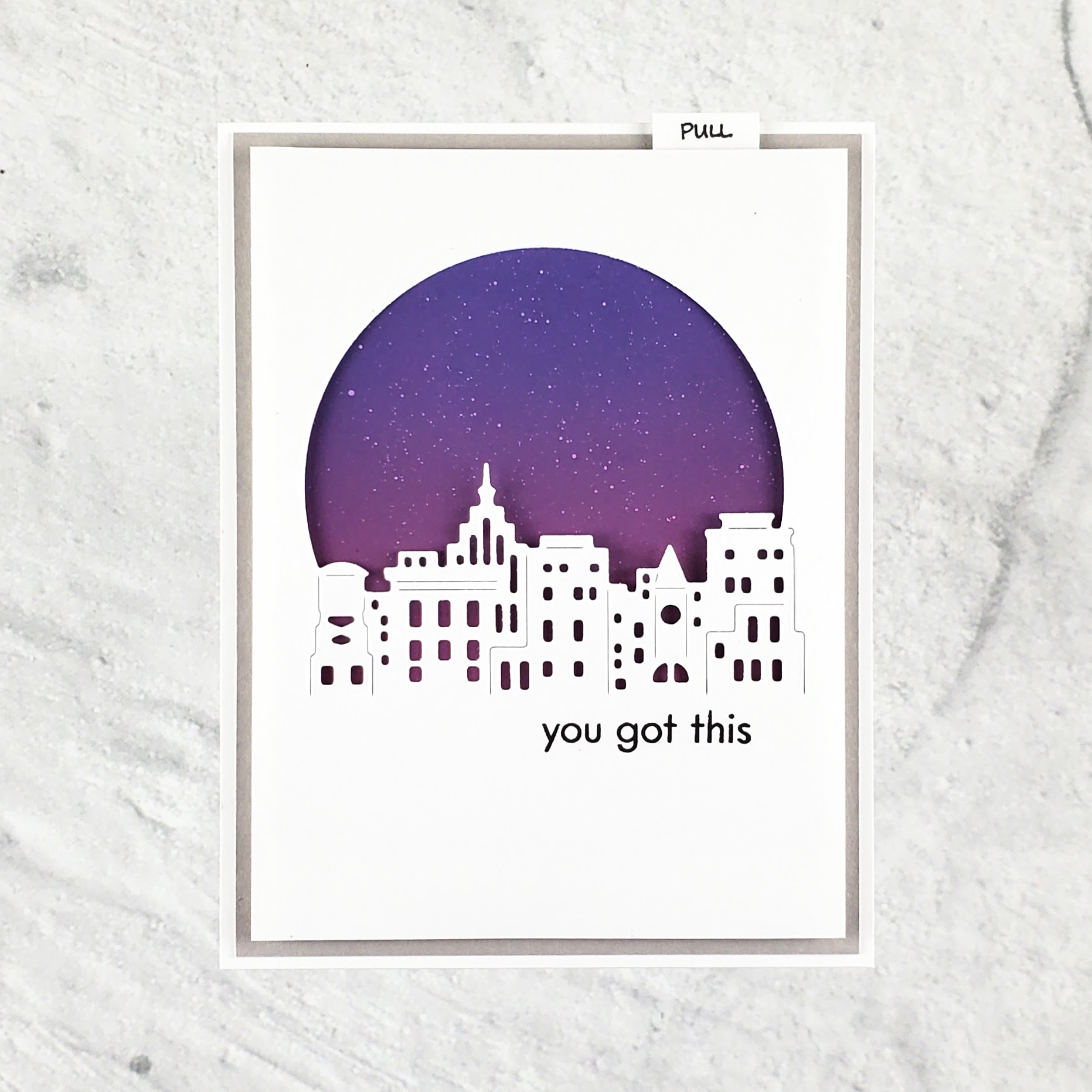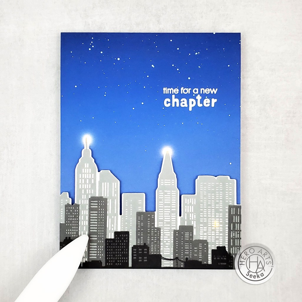 With the end of the year approaching I’ve been thinking a lot about all the things we’ve survived this year, and over our lifetimes. In the end, tomorrow always comes and we’re still here :). That feeling and sentiment where the inspiration for this card, featuring the Hero Arts City Window die, which has an interactive element to reveal a bright blue sky.