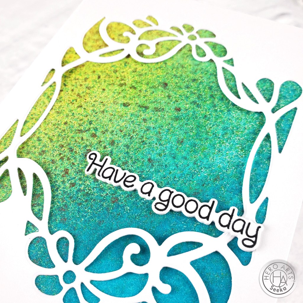 My second card features the Groovy Window Fancy Die, one of this month’s add-ons. For this quick and easy card I simply sprayed a 4.25″ x 5″ panel of white cardstock with two Hero Arts Two-Tone Metallic Sprays and then used the Groovy Window die to create a beautiful window in a panel of white cardstock. I glued the two panels together and then added a sentiment made with a stamp and die from the Cosmos and Lavender Bundle. To finish, I glued the card front to a card base.